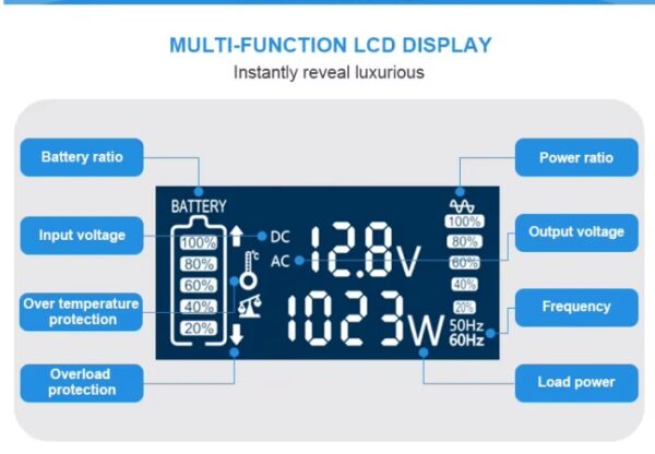 - LCD multi-función: batería, potencia, voltajes de entrada/salida, frecuencia, temperatura y alarmas.