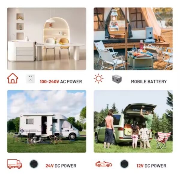 - Alimentación flexible: funciona con 12/24 V DC (auto, camión, camper) y 100–240 V AC (hogar/shore power).